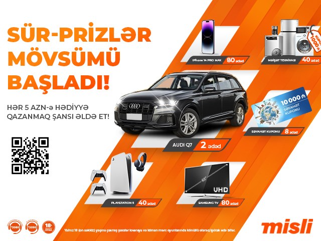 İki ay davam edəcək lotereyada ümumilikdə 8 ədəd 10 min manat dəyərində səyahət kuponu, 80 “iPhone 14 Pro Max”, 80 televizor, 40 “PlayStation 5”, 40 ədəd elektronika mağazasından 1000 manat dəyərində alış-veriş kartı və ən əsası 2 ədəd “Audi Q7 Comfort Plus” avtomobili sahiblərini gözləyəcək.