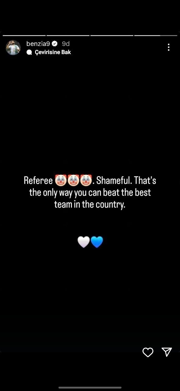 Sportal.az xəbər verir ki, hakimin verdiyi qərarlarla yadda qalan matçdan sonra "Qarabağ"ın sabiq futbolçusu Yassin Benzia sosial şəbəkə hesabından paylaşım edib.